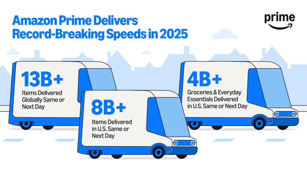 Amazon boasted that Prime members in the US received over 8 billion items the same or next day in 2025, over 30% more compared to 2024. It estimated that members saved an average of $550 on fast, free delivery last year, “nearly four times the cost of an annual membership.”
