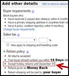 A Top Rated eBay seller noticed over the weekend that when they are in the listing form, it's hardwired to read "Accept holiday returns until December 31" with no way for them to change it. (See the accompanying graphic.) Their default return period is 14 days (not by choice - it's required in order to receive Top Rated Plus benefits, including TRS discounts).