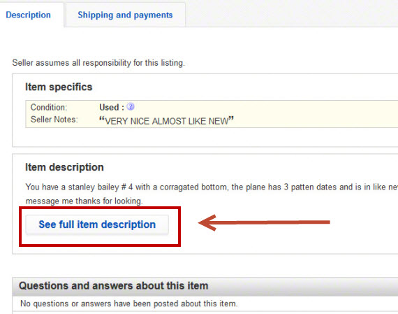 I haven't browsed on eBay for many months. A few minutes ago, I decided to search for "stanley plane" and browse through the 5,000 listings that resulted. I clicked on a listing only to discover that I was apparently opted back into the eBay hide-the-description program. Clicking on the button leads to a "full description" popup. I'm not doing that. Sorry. No more browsing on eBay for me. I'm done.