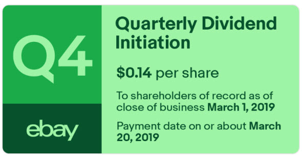 "We delivered record earnings for the fourth quarter and full year 2018," said Devin Wenig, President and CEO of eBay Inc. "In 2019, our focus will be on further improvements to the eBay user experience, while pursuing significant long-term growth opportunities in advertising and payments. We are confident in the strength of our business and future growth prospects, as demonstrated by our decision to institute eBay's first-ever dividend and increase our share repurchase program."